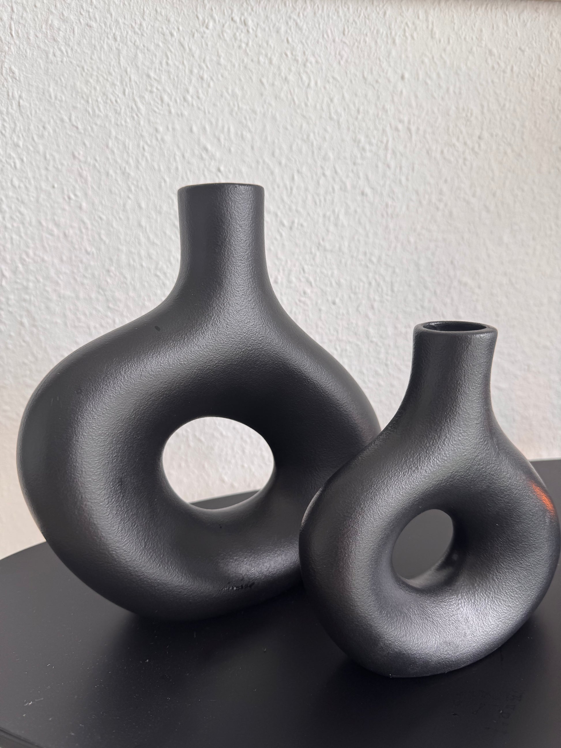Verleihen Sie Ihrem Zuhause einen modernen und stilvollen Akzent mit dem wunderschönen Vasen-Set Luna. Diese Keramikvasen zeichnen sich durch ihr einzigartiges Design aus- eine elegante Form mit einem faszinierenden Loch in der Mitte, das einen Hauch von Kreativität und Raffinesse vermittelt.