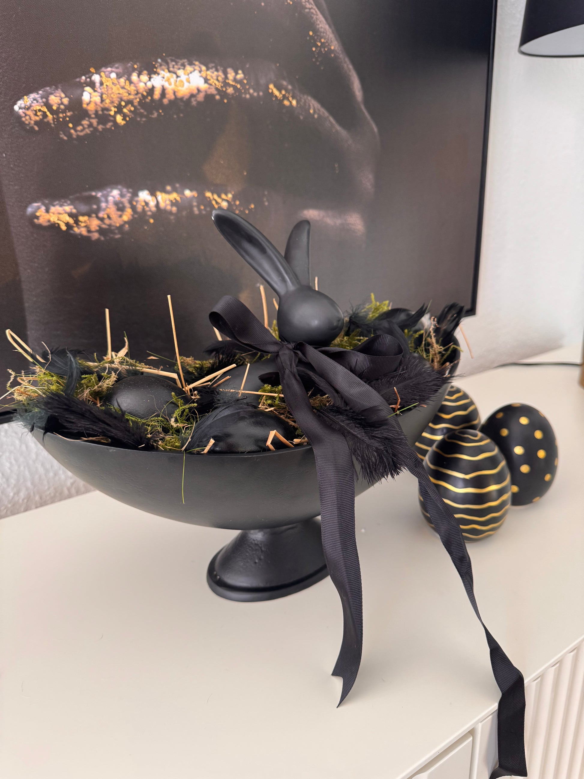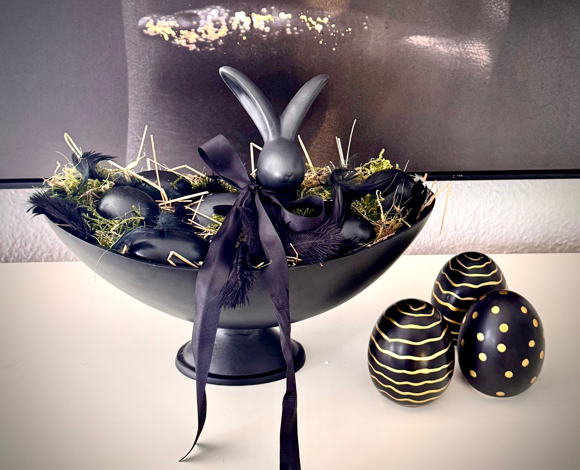 Black & Gold ist der Trend für ein modernes Osterfest. Diese hochwertigen Deko-Eier der Marke Exner bestechen durch ihre elegante schwarze Grundfarbe, verziert mit feinen goldenen Wellen und Punkten. Sie sind die idealen Begleiter für moderne Osterhasen und fügen sich perfekt in den " Glamour - oder Modern Living" - Wohnstil ein. Ob einzeln platziert oder als Gruppe arrangiert - diese 9 cm großen Eier setzen stilvolle Akzente auf Ihrer Festtafel.