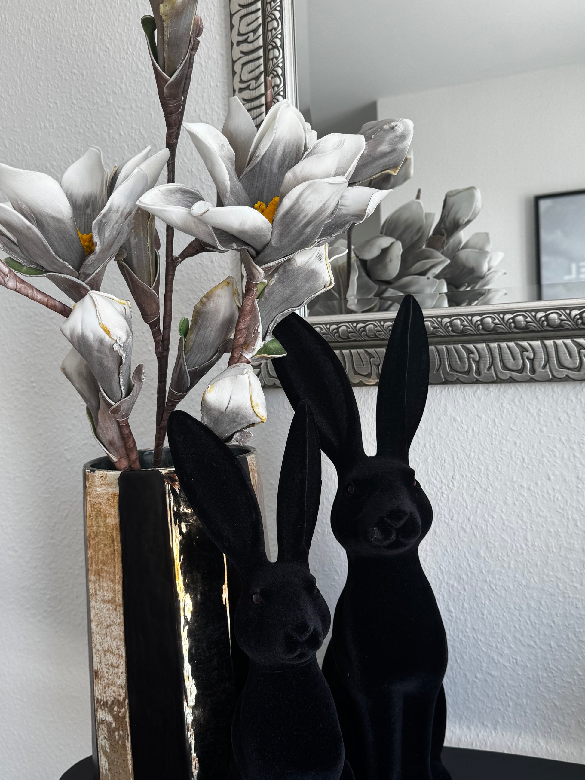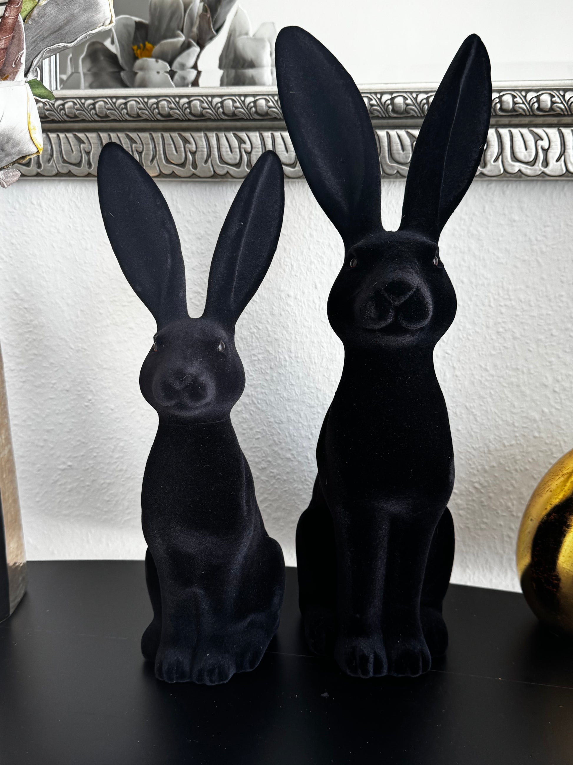 Verleihen Sie Ihrem Zuhause eine Note von moderner Eleganz mit dem Deko Hasen "Vincent". Anders als herkömmliche Osterdekoration besticht Vincent durch sein minimalistsches Design und seine edle Tiefschwarze Optik. Durch die samtartige Beflockung wirkt die Oberfläche besonders hochwertig und weich, was diesen Hase zu einem stillvollen Wohnaccesoire für das ganze Jahr macht.