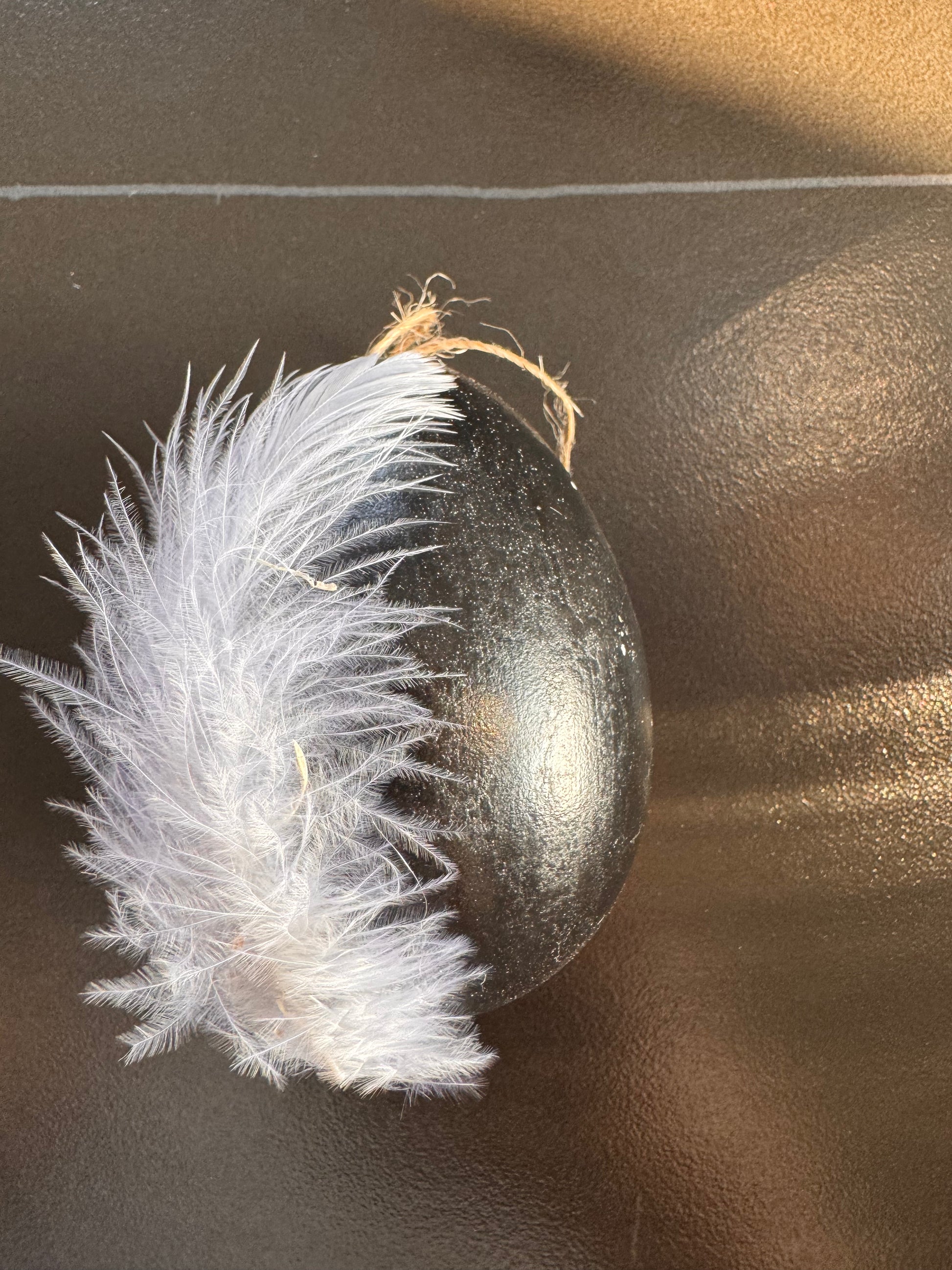 Verleihen Sie Ihrer Osterdeko einen Hauch von Eleganz und Modernität. Dieses Set aus sechs schwarzen Ostereiern besticht durch sein minimalistisches Design und den zarten Kontrast echter Federn. Gehalten an einer rustikalen Jute-Kordel, passen diese Anhänger perfekt zum angesagten Scandi-Style, Industrial Look.