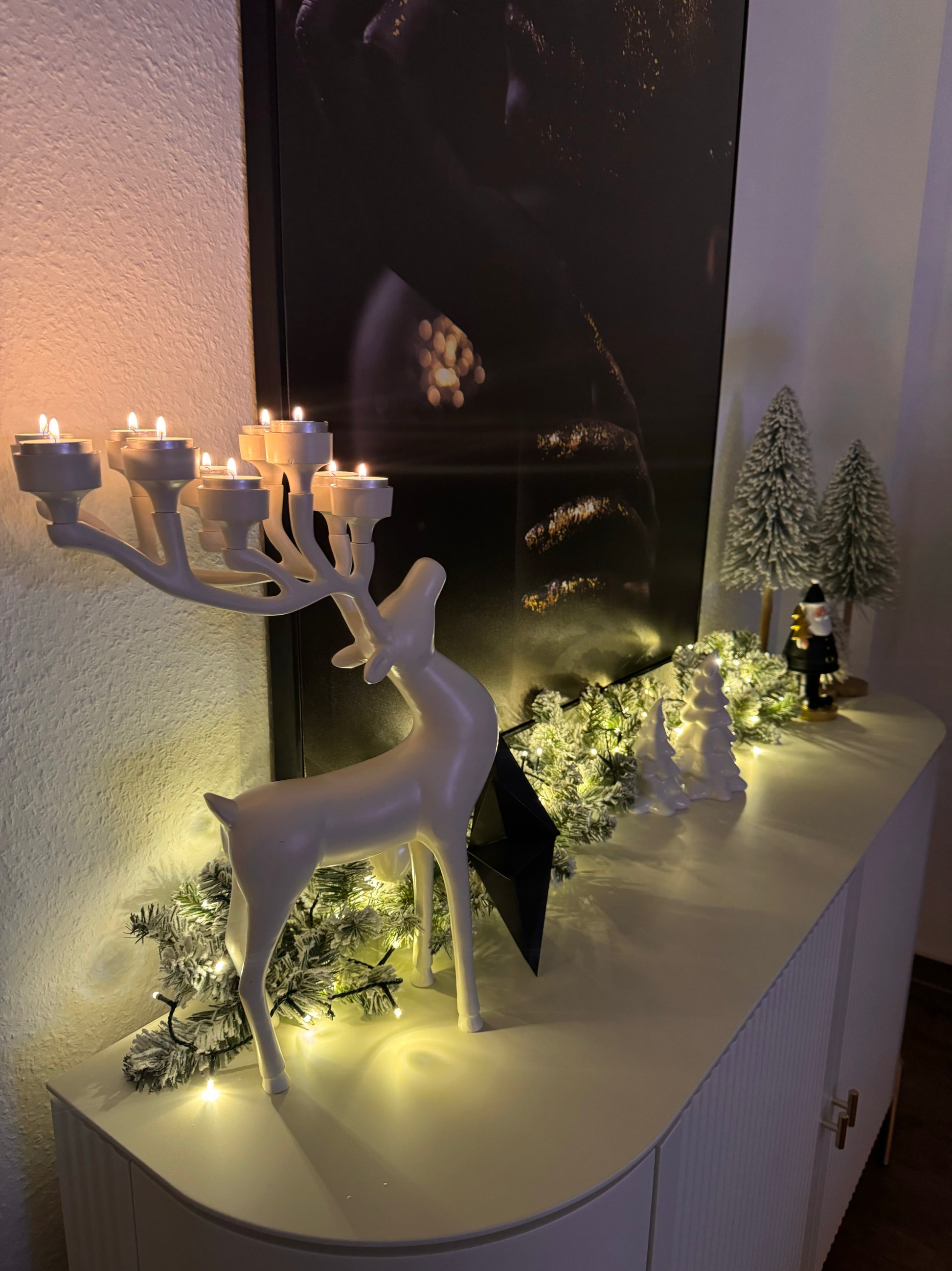 Bringen Sie festlichen Glanz und stilvolle Eleganz in Ihr Zuhause mit dem Hirsch-Kerzenleuchter in edlem Weiß. Das außergewöhnliche Design verbindet moderne Schlichtheit mit einem Hauch von Winterromantik: Der fein gearbeitete Hirsch trägt auf seinem majestätischen Geweih stilvolle Halterungen für Kerzen.