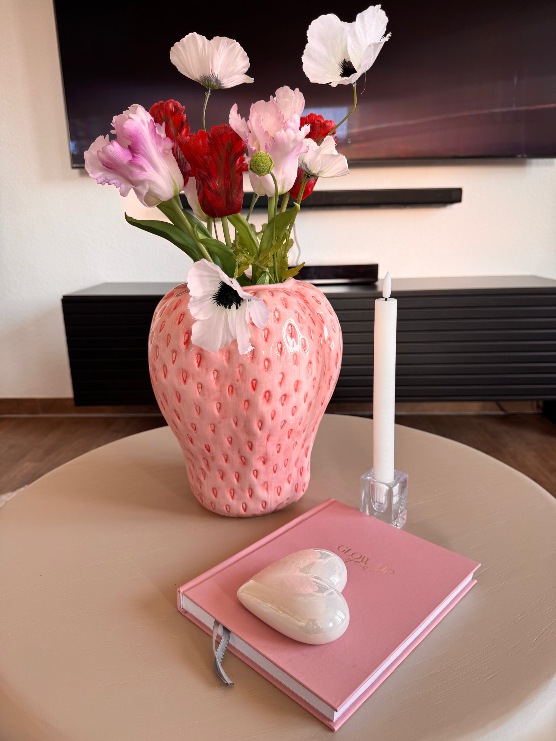 Verleihen Sie Ihrem Zuhause eine verspielte und fröhliche Note mit unserer liebevoll gestalteten Erdbeer-Vase. Das einzigartige Design in Form einer saftigen Erdbeere mit dekorativen roten Einsätzen macht diese Vase zu einem echten Blickfang. Das elegante, leicht glänzende Finish bringt die natürliche Frische der Frucht direkt in ihr Zuhause.