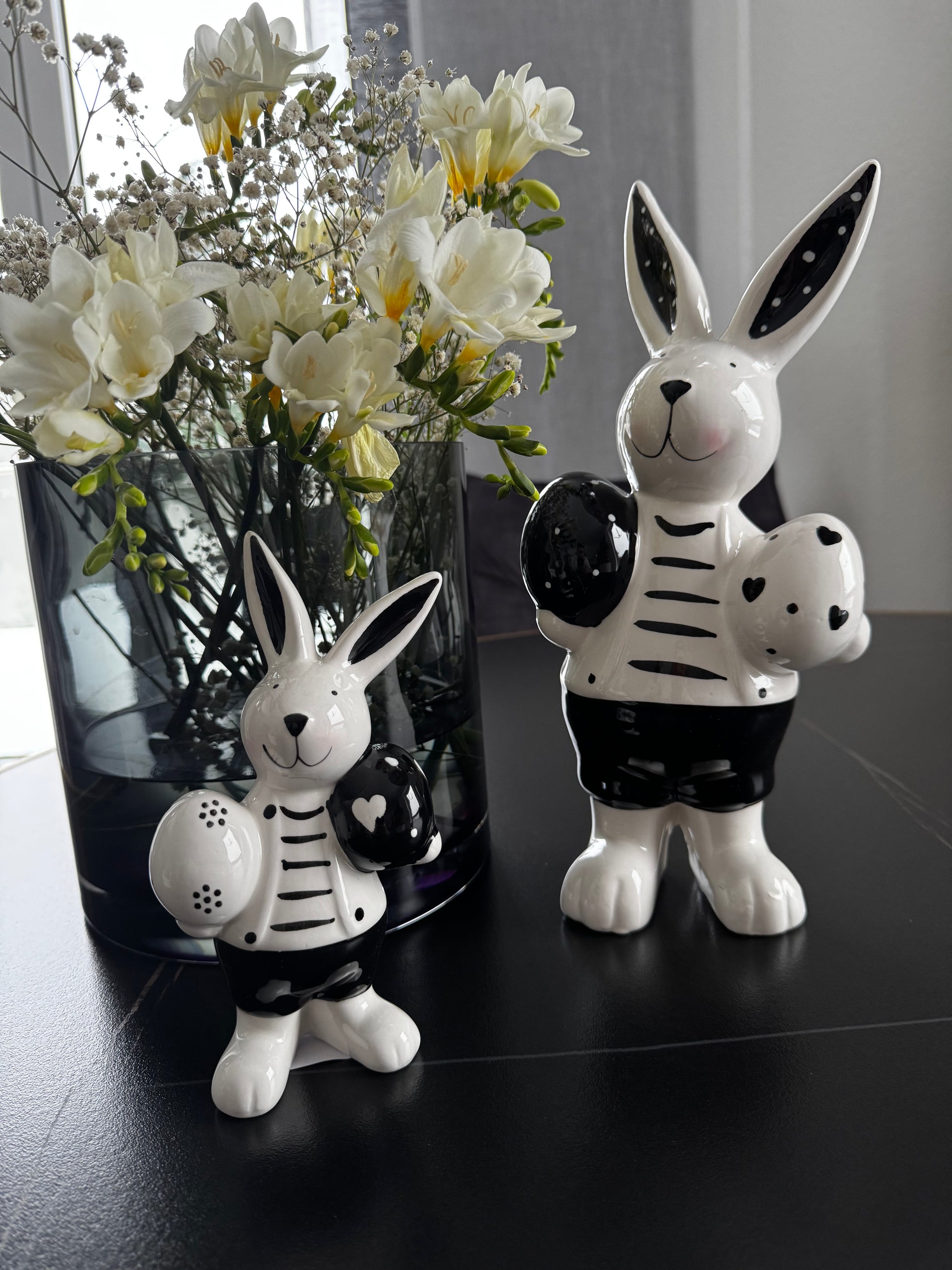 Bringen Sie frischen Wind in Ihre Osterdekoration mit diesem charmanten Keramik-Hasen der Marke Wurm. Durch die zeitlose Farbkombination aus Schwarz und Weiß passt diese Figur perfekt in moderne Wohnambiente und setzt stilvolle Akzente auf jedem Tisch oder Sideboard. Der Hase überzeugt durch eine elegantes grafisches Design. Die Figur trägt eine gestreiftes Oberteil und hält zwei Eier im Arm .