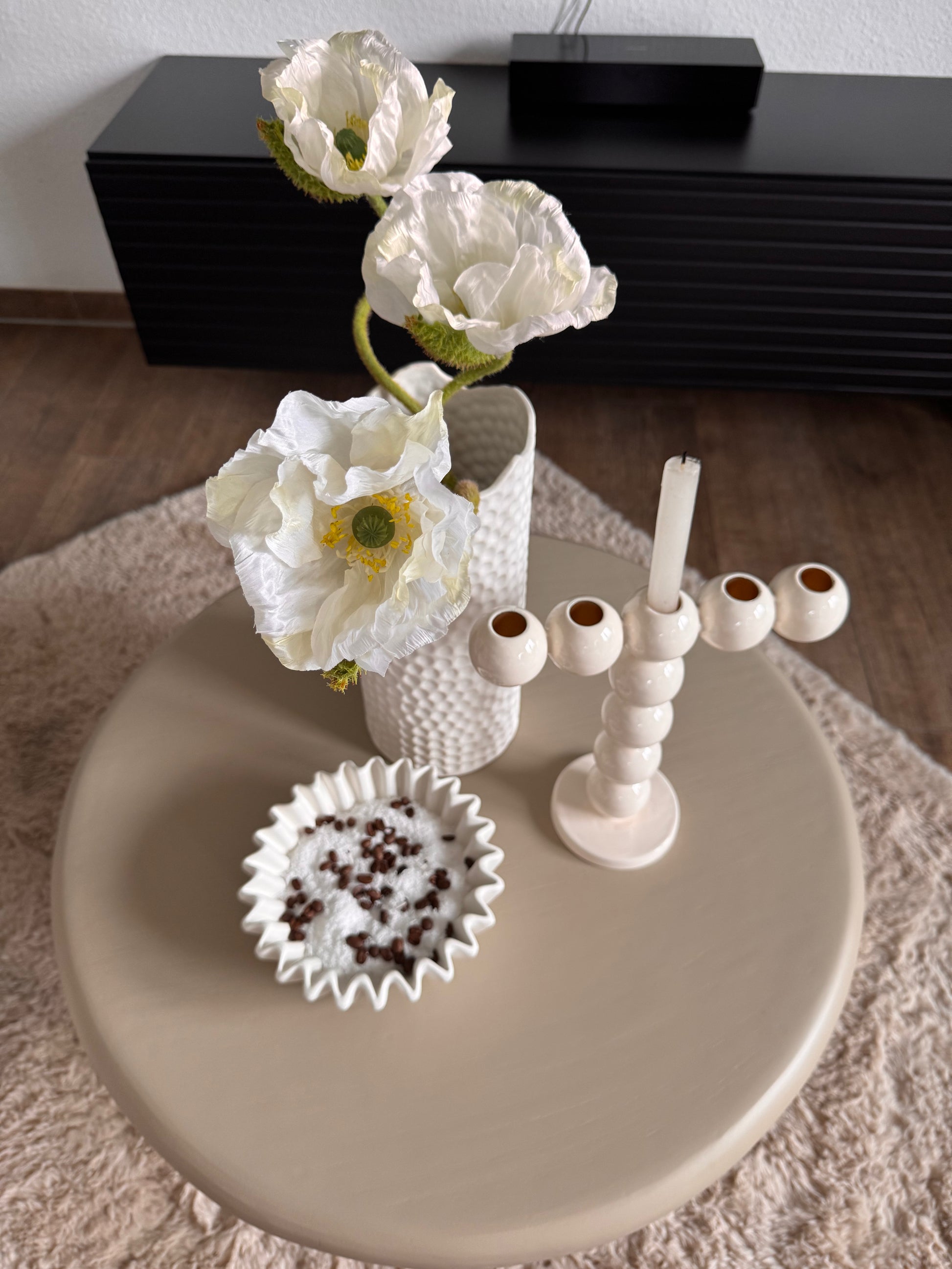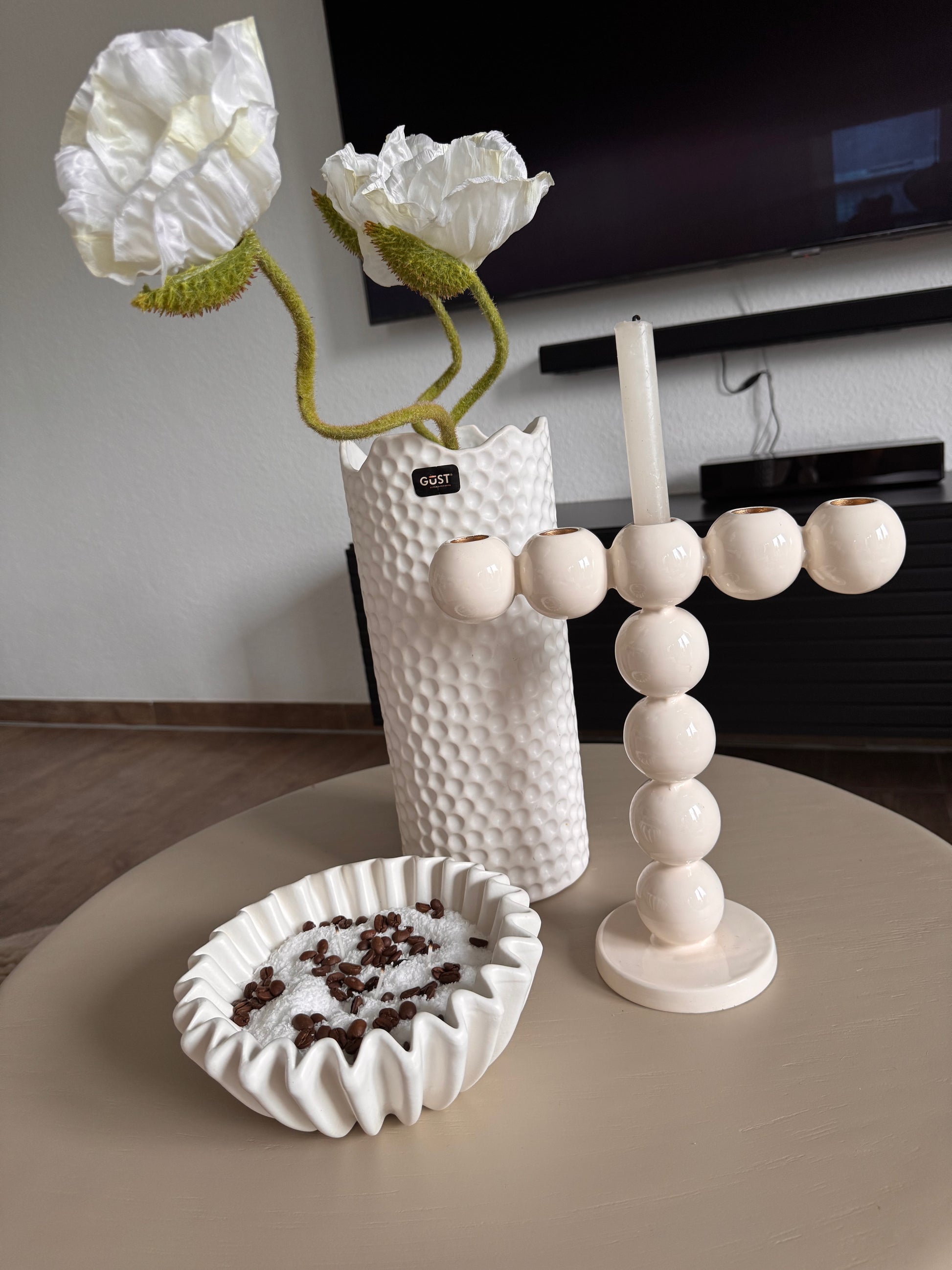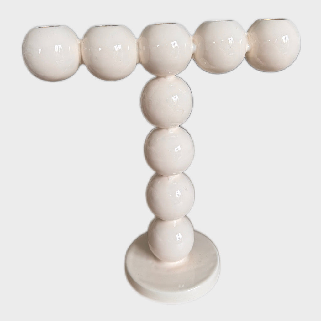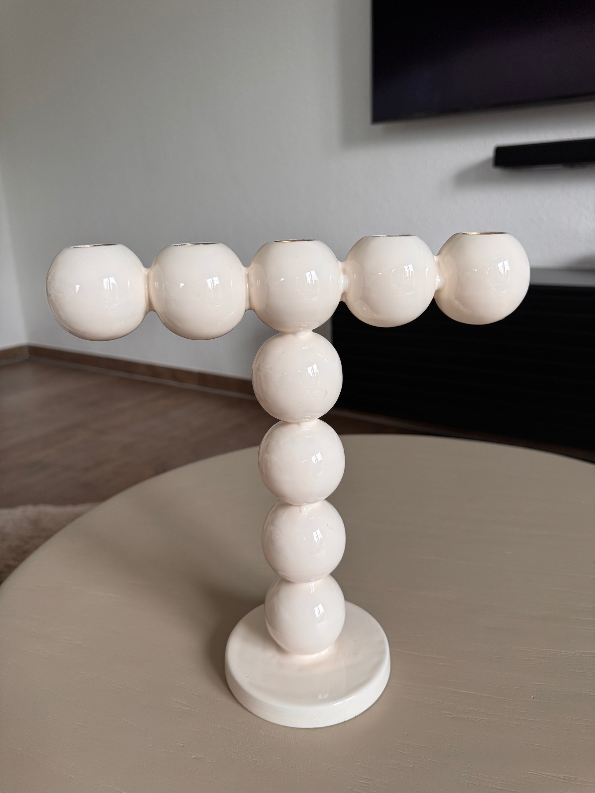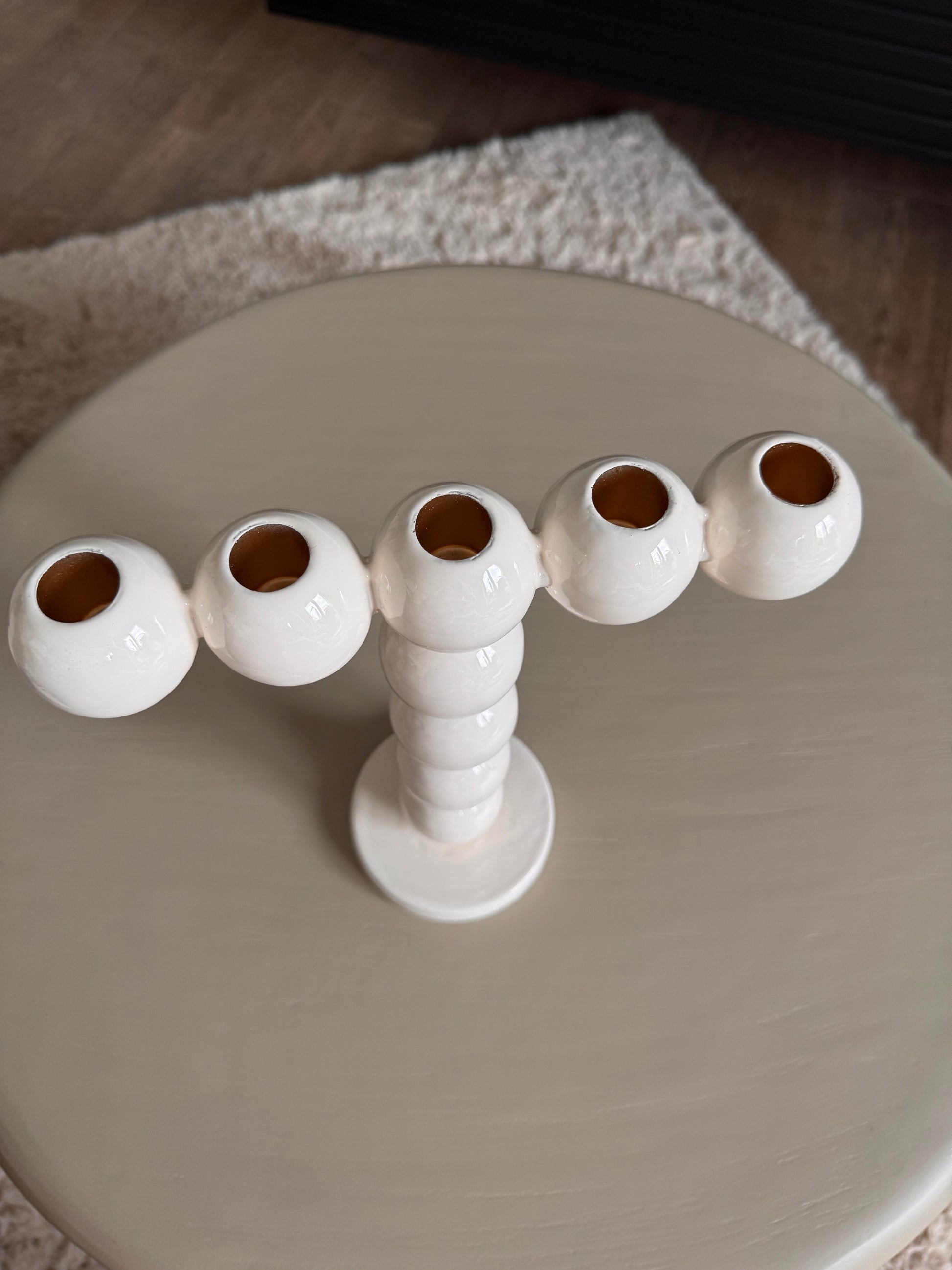 Das besondere Merkmal ist die doppelte Hubble-Optik, die für einen verspielten und gleichzeitig eleganten Look sorgt. Ob als Highlight auf dem Esstisch, im Wohnzimmer oder im Eingangsbereich - dieser Kerzenhalter setzt stilvolle Akzente und schafft eine warme, einladende Atmosphäre. Perfekt geeignet für Stabkerzen, die durch die großzügigen Kugeln besonders schön zur Geltung kommen. Ein außergewöhnliches Dekor-Accessoire für jeden modernen Wohnstill !