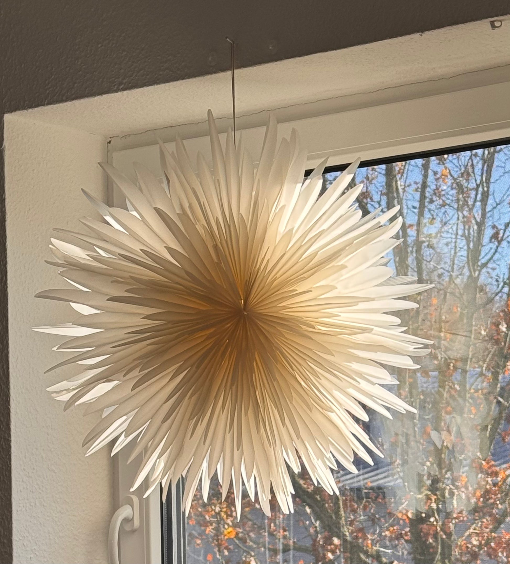 Bringen Sie stilvolle Eleganz und ein einzigartiges Ambiente in Ihr Zuhause mit der Origami Papierlampe! Das kunstvolle Design erinnert an eine zarte Blüte oder einen leuchtenden Stern und wird garantiert zum Blickfang in jedem Raum.
