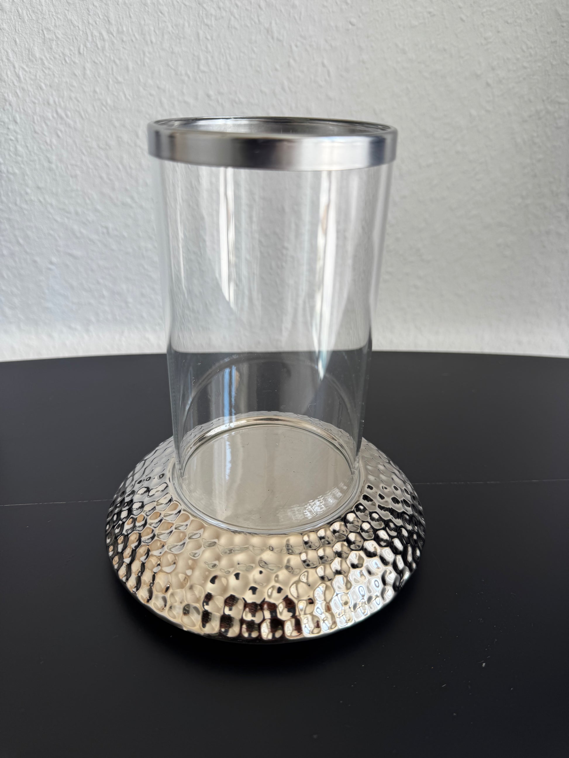 Verzaubern Sie Ihre Wohnräume mit dem stilvollen Windlicht aus der exklusiven Kollektion von Exner. Dieses Wohnaccessoire vereint klassische Eleganz mit moderner Handwerkskunst und sorgt für stimmungsvolle Lichtmomente in Ihrem Zuhause. Das Design besticht durch die Kombination aus klarem Glas und einem massiven, silbernen Sockel in gehämmerter Optik. Der obere Rand des Glases wird von einem feinen Silberring abgeschlossen, was dem Windlicht einen harmonischen und hochwertigen Rahmen verleiht.